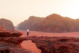 Climbing in Wadi Rum is a captivating experience as you ascend the desert’s spectacular sandstone masses and experience the vastness of this scenic desert. You are rewarded with a magical panoramic view of Wadi Rum and a view of Disi village below. The B Adventure team, who are seasoned and professional and have climbed summits all around the world, will guide you on this wonderful journey. The majestic mountains of Wadi Rum have long enticed the local Bedouin to climb and explore their sandstone heights. The Bedouin have their own routes up the mountains, which have been explored and added to by climbers from around the world. This magnificent desert offers a stunning selection of climbs of varying levels. Take this wonderful opportunity to explore one of these routes, in Barrah Canyon, and take in the breathtaking desert views along the way. This climb is offered at introductory and more experienced levels. Your climbing guides will provide the necessary gear and teach you to scale a section of Abu Judaidah Mountain. On the way up, there are ancient Nabataean structures, including steps carved into the rock that lead to a spring near the top of the mountain.